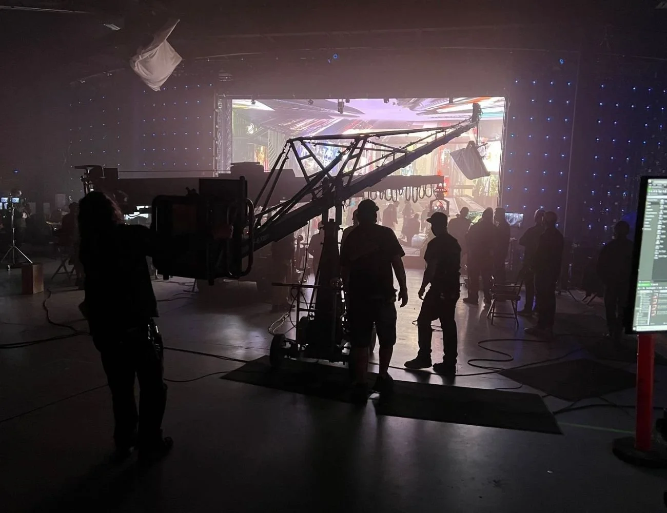 In addition to the main LED walls, multiple large portable panels were calibrated and tracked inside the volume. These custom-made panels with built-in tracking systems allowed for easy reconfiguration in the nDisplay system without recalibrating the volume each time we wanted to move a ‘wild’ wall in quickly on set. This flexibility meant that if additional images were needed on the floor or inside a particular blocking, the portable screens could be wheeled in – fully logged – and display the right images relative to the master camera, enhancing efficiency on set.